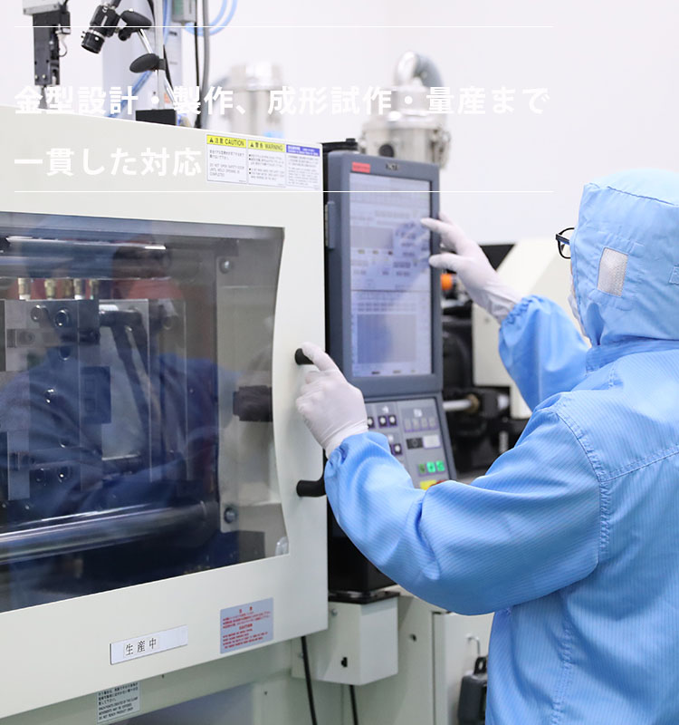 また金型設計・製作だけではなく、試作品成形から量産成形まで幅広く製品の生産に対応しておりますので、一貫した対応が可能です。